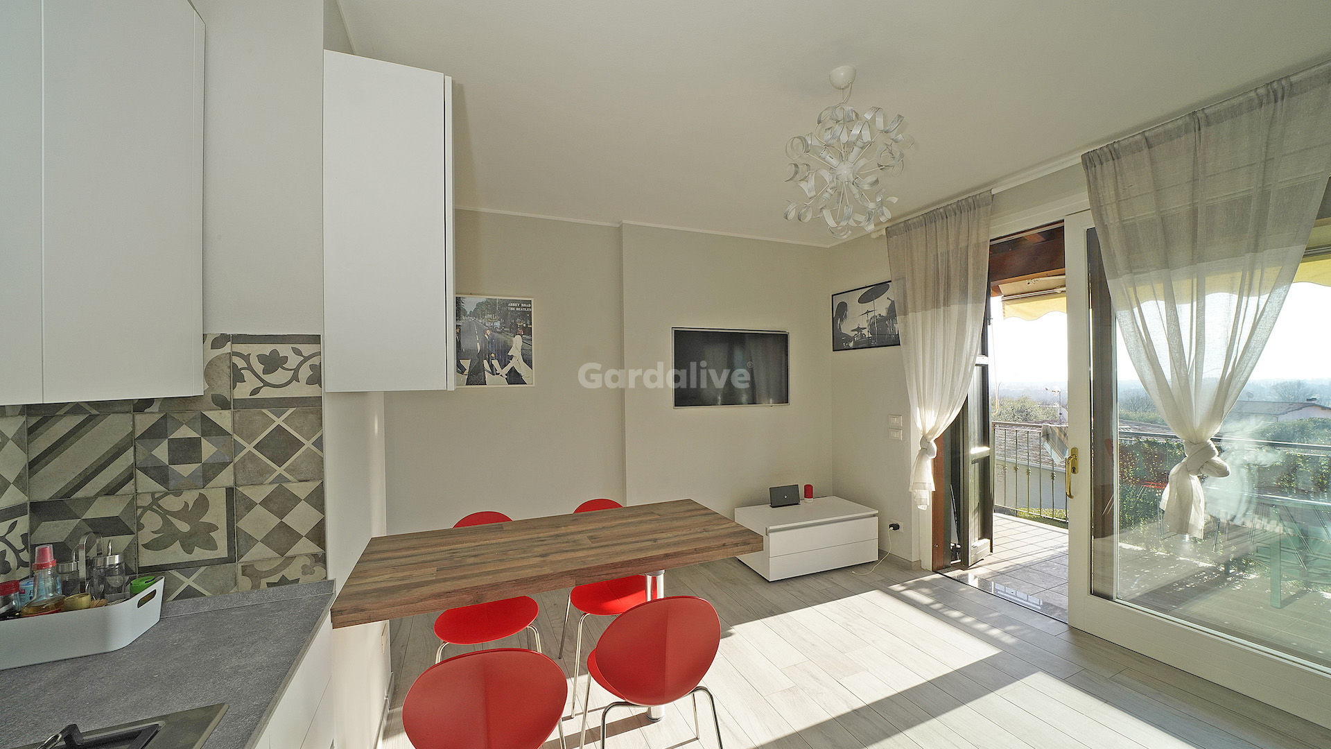 L’ingresso conduce direttamente alla loggia, dalla quale si accede alla zona giorno con cucina a vista, luminosa grazie alla porta finestra che affaccia sul panorama. La zona notte comprende una camera matrimoniale e un bagno finestrato con doccia, entrambi ben distribuiti e funzionali.