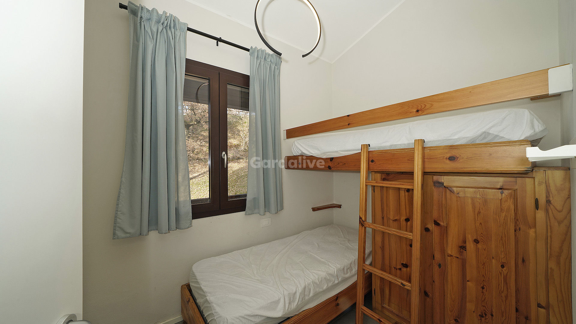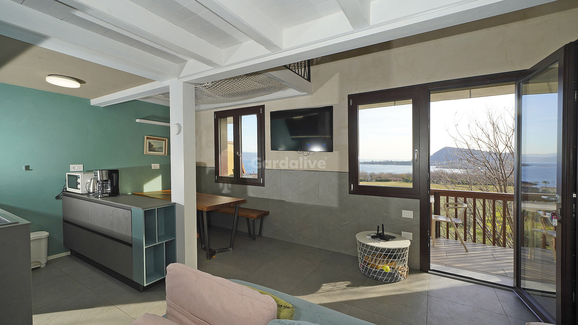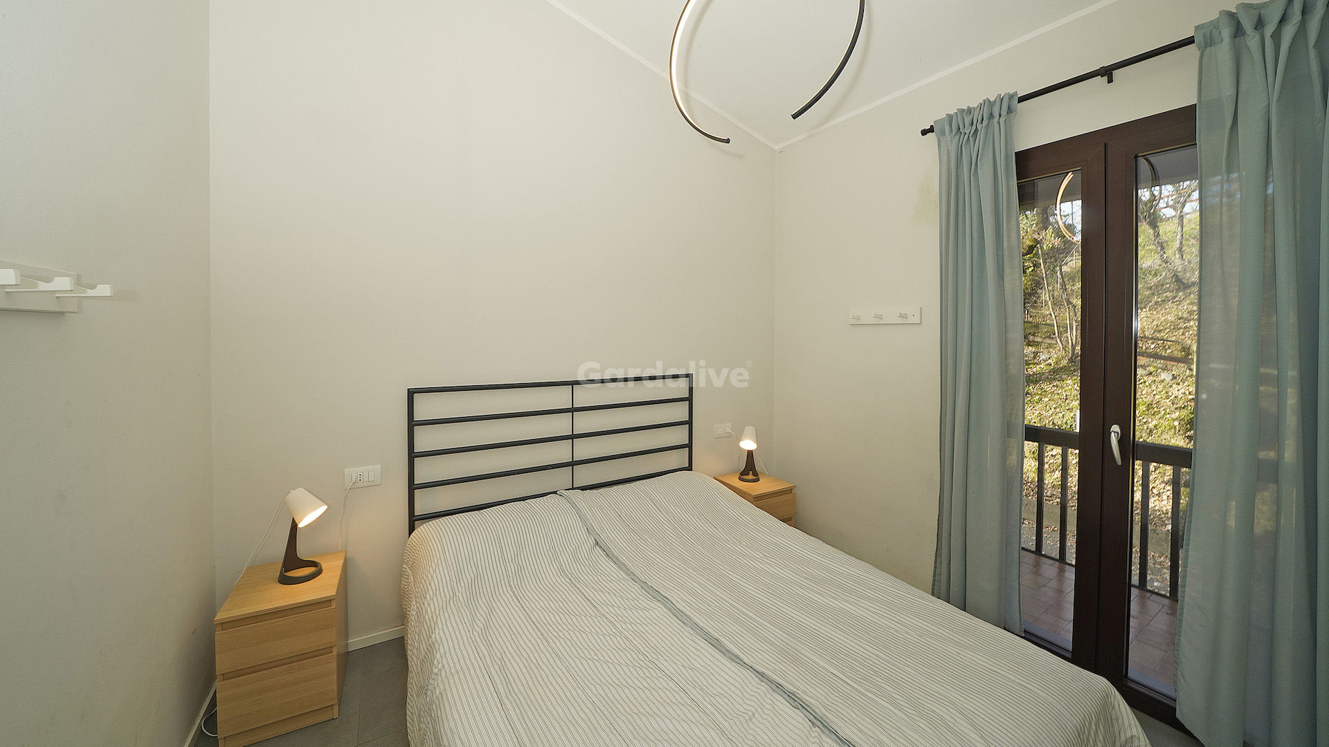 L’abitazione, posta al primo piano e sviluppata su due livelli, è stata completamente rinnovata solo quattro anni fa, con interventi mirati sia sulla struttura che sugli impianti, oggi interamente elettrici. Gli interni, moderni e pronti per essere abitati senza ulteriori lavori, offrono ambienti funzionali e luminosi: una zona giorno con cucina a vista e accesso al balcone panoramico, due camere al piano inferiore, un bagno dal design contemporaneo e, al livello superiore, una suggestiva camera open space che regala fascino e unicità. Dal soggiorno e dal terrazzo si gode di una splendida vista lago, perfetta per ammirare i tramonti gardesani.
