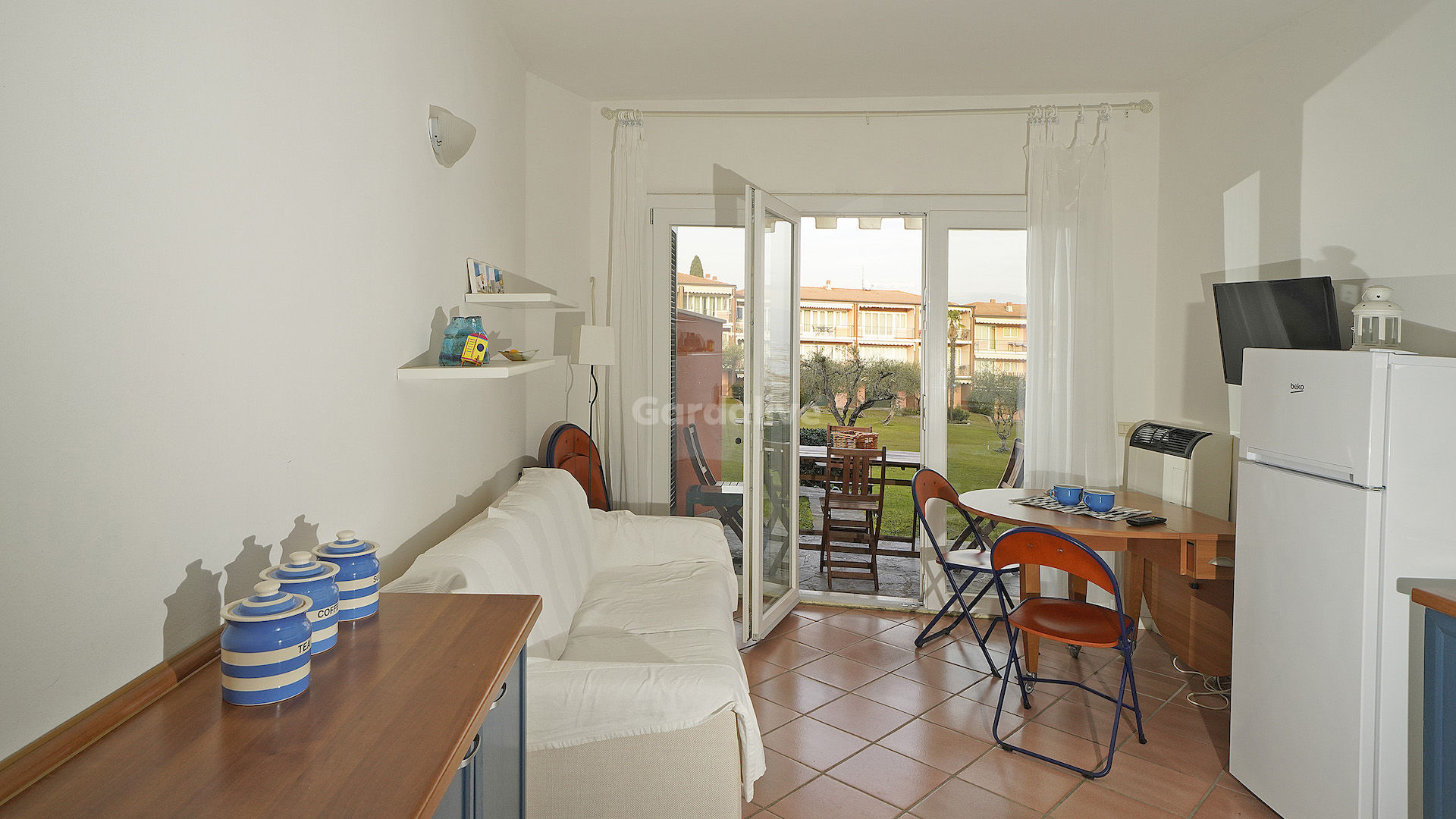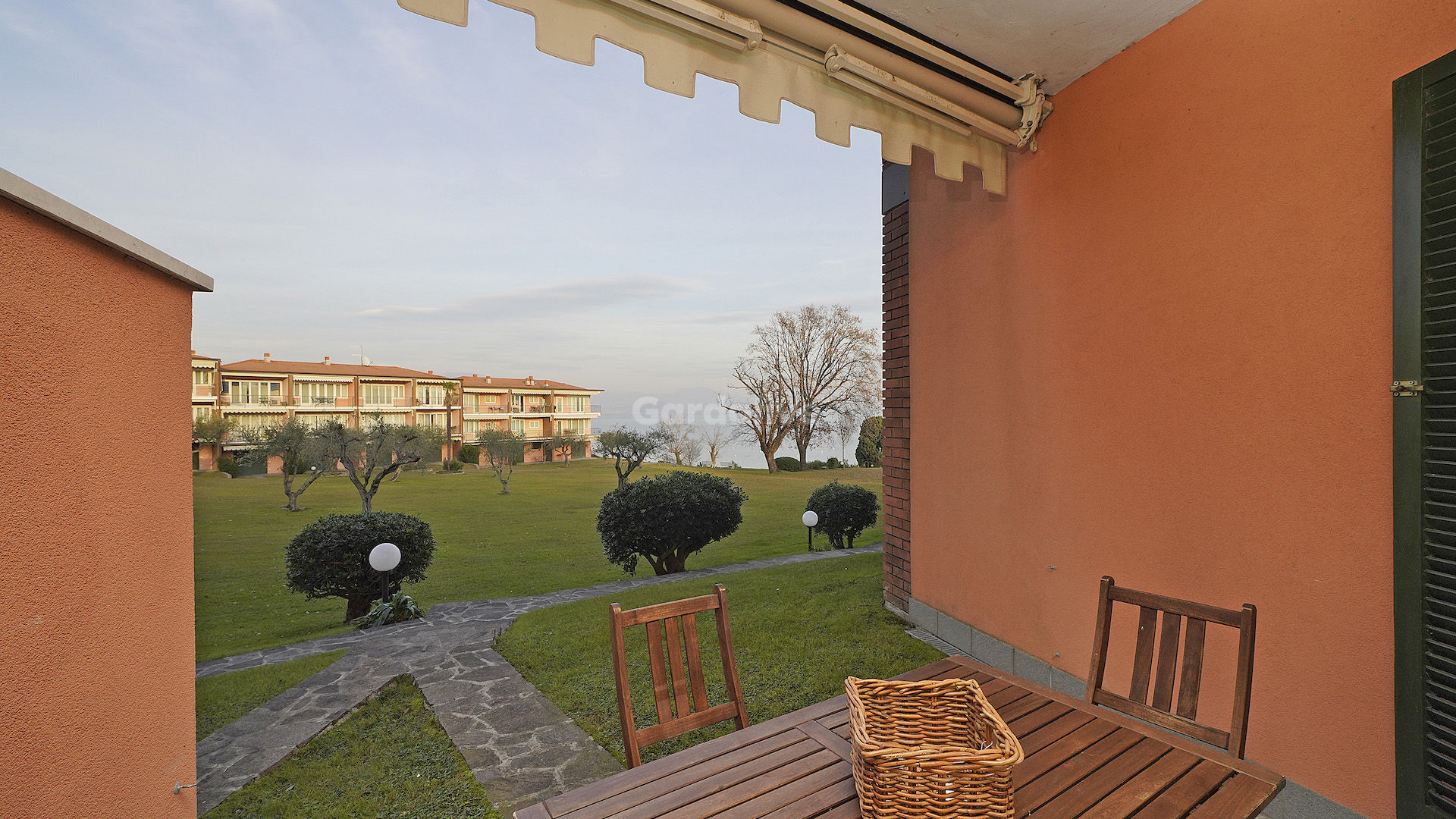 L’immobile si apre su una luminosa zona giorno con cucina a vista, valorizzata da una grande vetrata che conduce al portico privato, perfetto per pranzi all’aperto e momenti di relax. Dal portico si accede direttamente al parco condominiale e all’area piscina, godendo di una vista lago di grande impatto. La zona notte comprende una camera ben proporzionata e un bagno moderno e funzionale, entrambi rifiniti con materiali contemporanei.