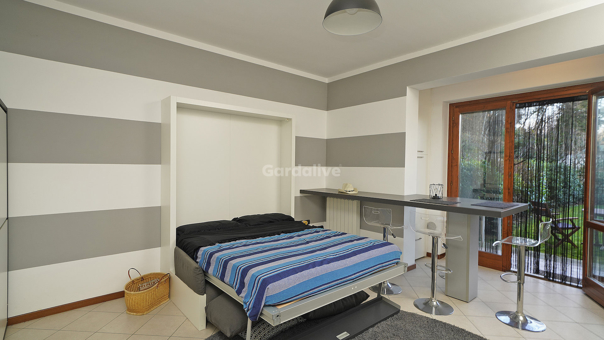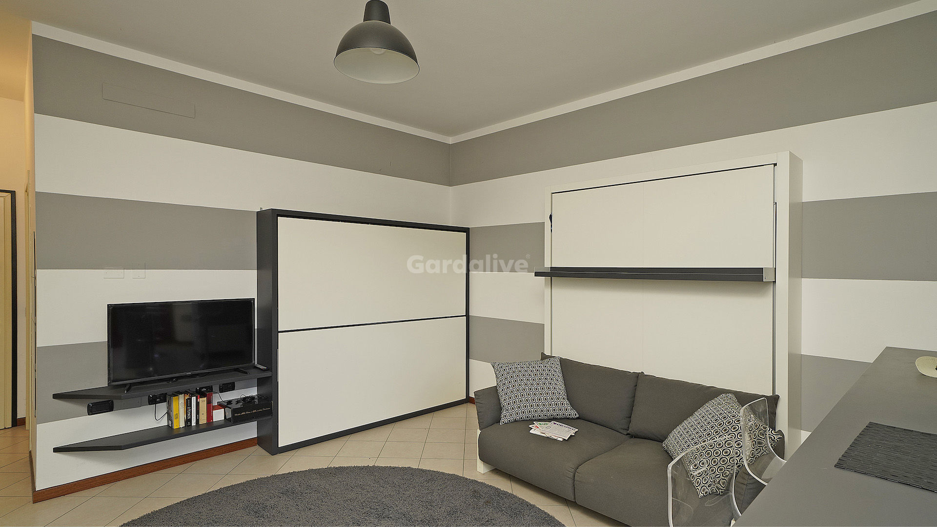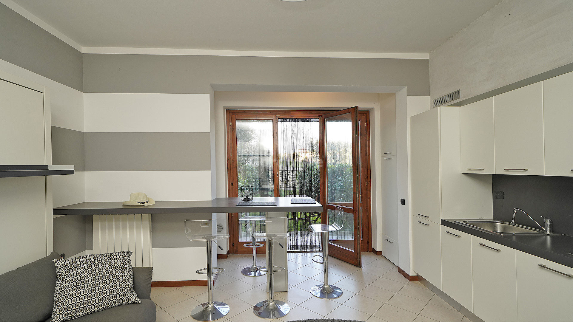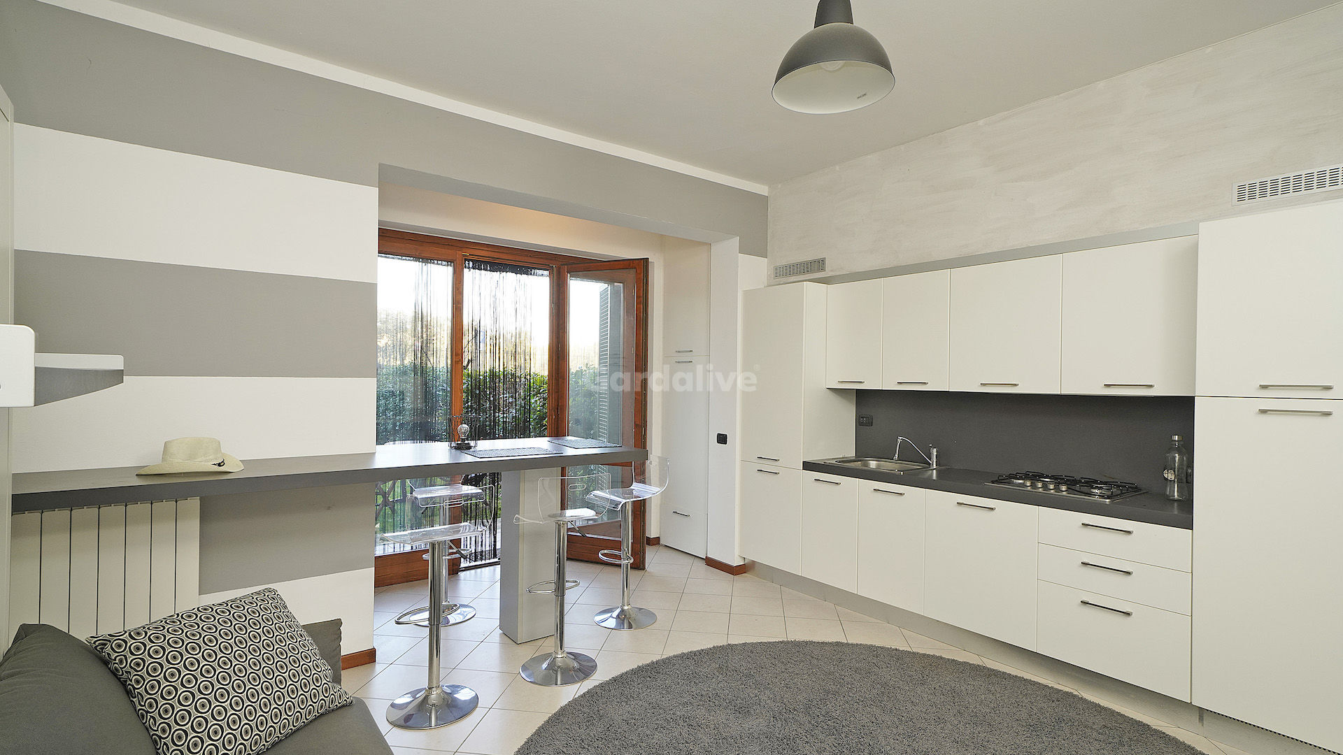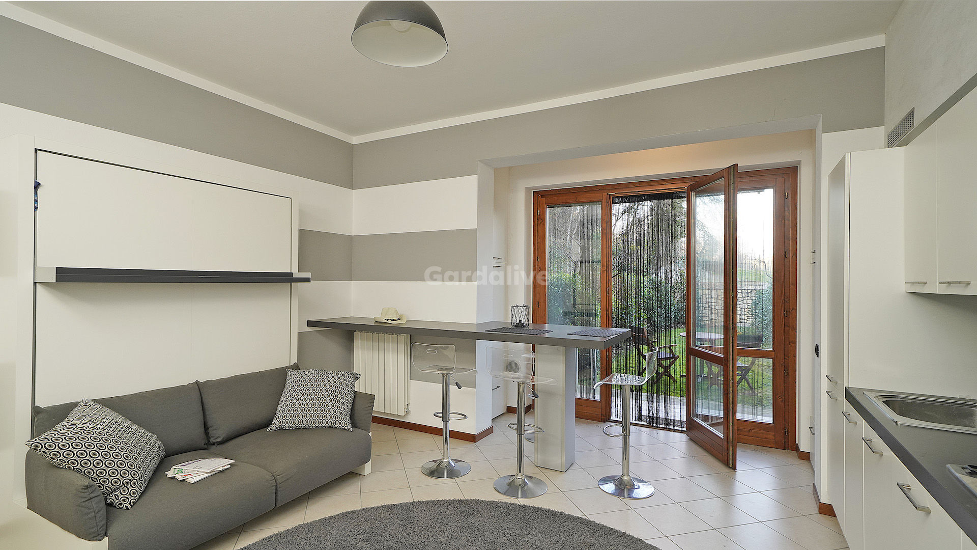 L’ambiente è stato studiato per trasformarsi facilmente da zona living a zona notte grazie a soluzioni d’arredo intelligenti con letto a scomparsa. La cucina a vista con penisola e tavolo integrato rende lo spazio pratico e moderno. Completa l’interno un bagno con doccia e antibagno attrezzato per lavatrice e asciugatrice. Una grande porta finestra conduce al giardino privato, da cui si godono piacevoli scorci di vista lago.