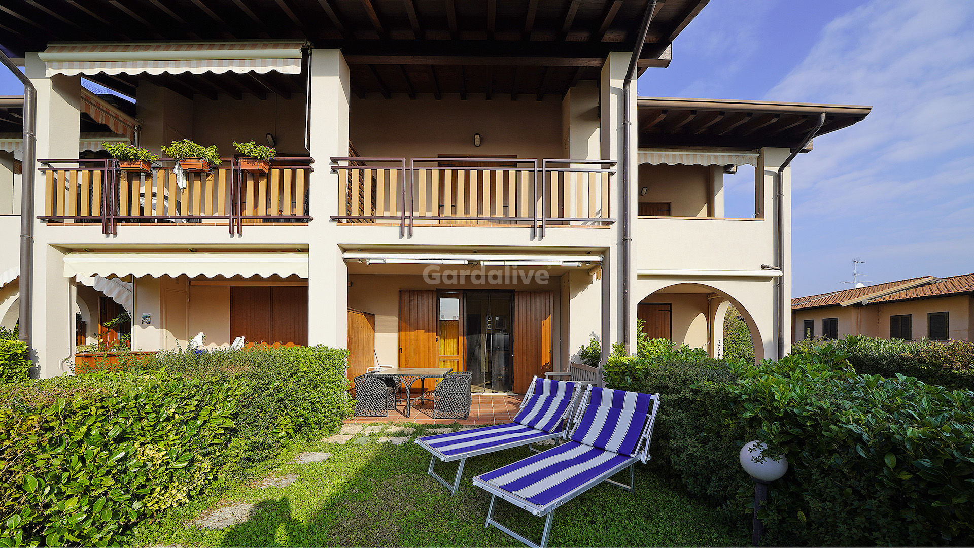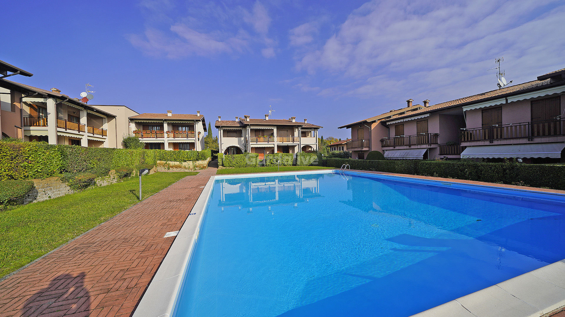 Appartamento con giardino privato in residence con piscina e vista lago
