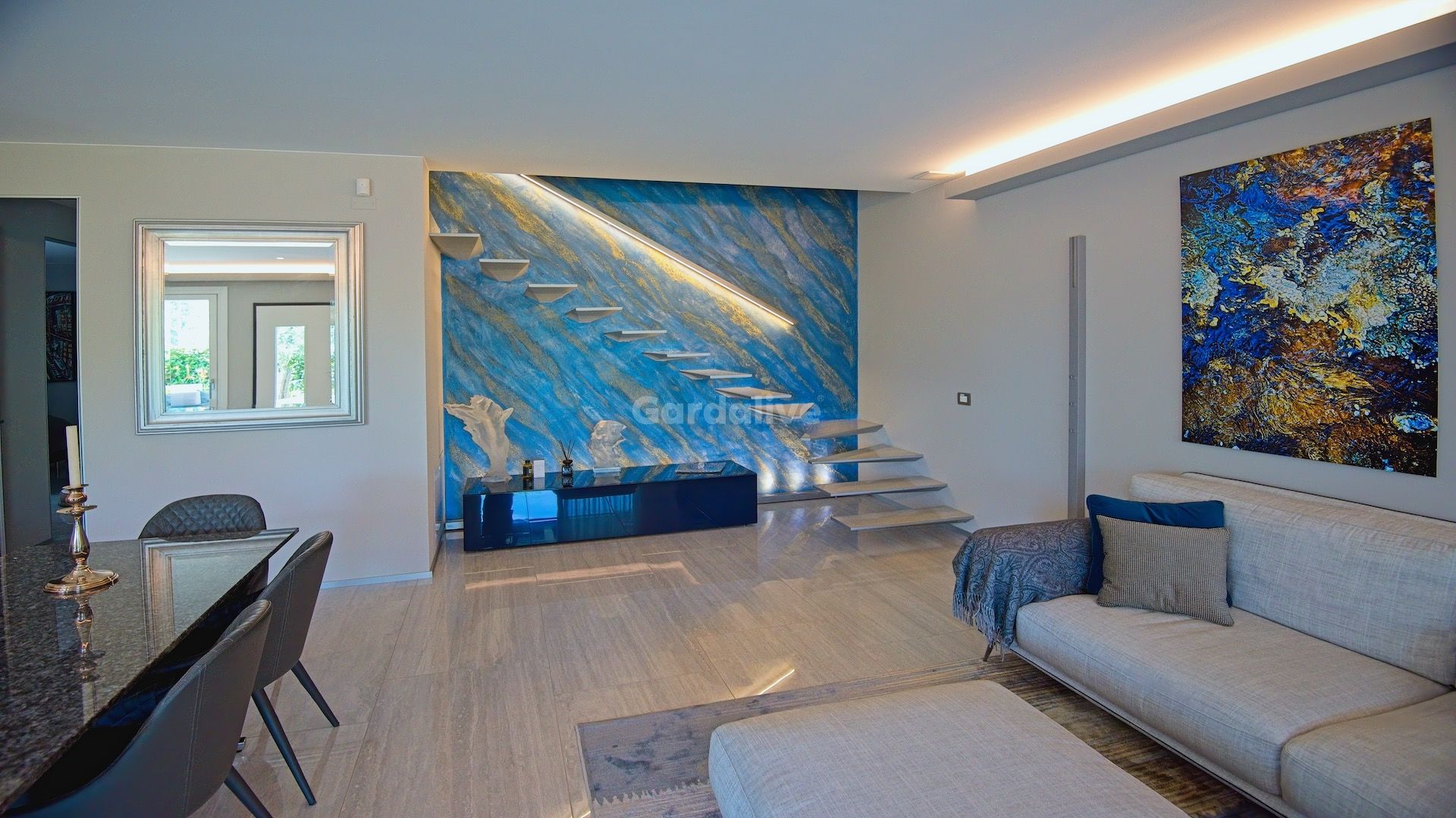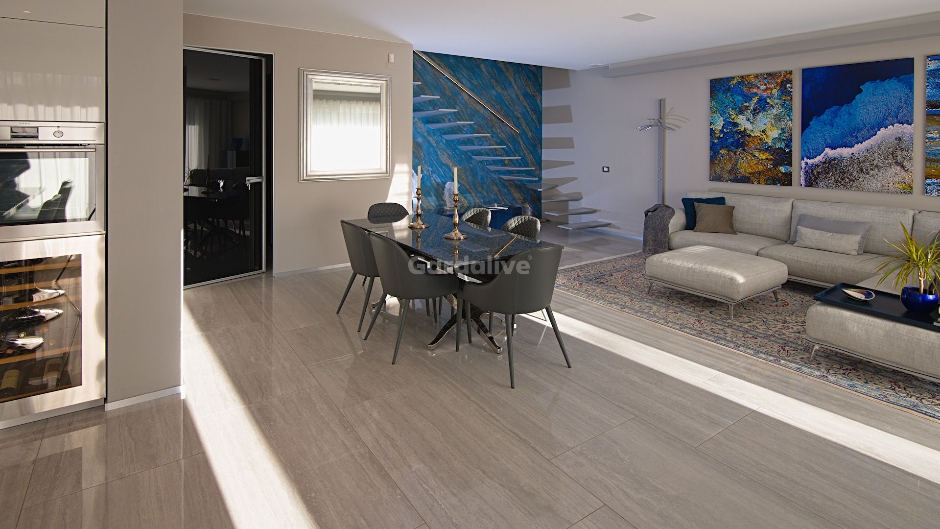 L'ingresso principale si apre su un'ampia e luminosa zona soggiorno/cucina/pranzo. Splendide piastrelle in gres porcellanato, una cucina di design, illuminazione d'atmosfera e porte a filo Rimadesio™creano un'atmosfera elegante con i comfort del riscaldamento e raffrescamento a pavimento e dell'aria filtrata. Un sistema di allarme con porta blindata e finestre con triplo vetro garantiscono un ambiente sicuro e tranquillo.