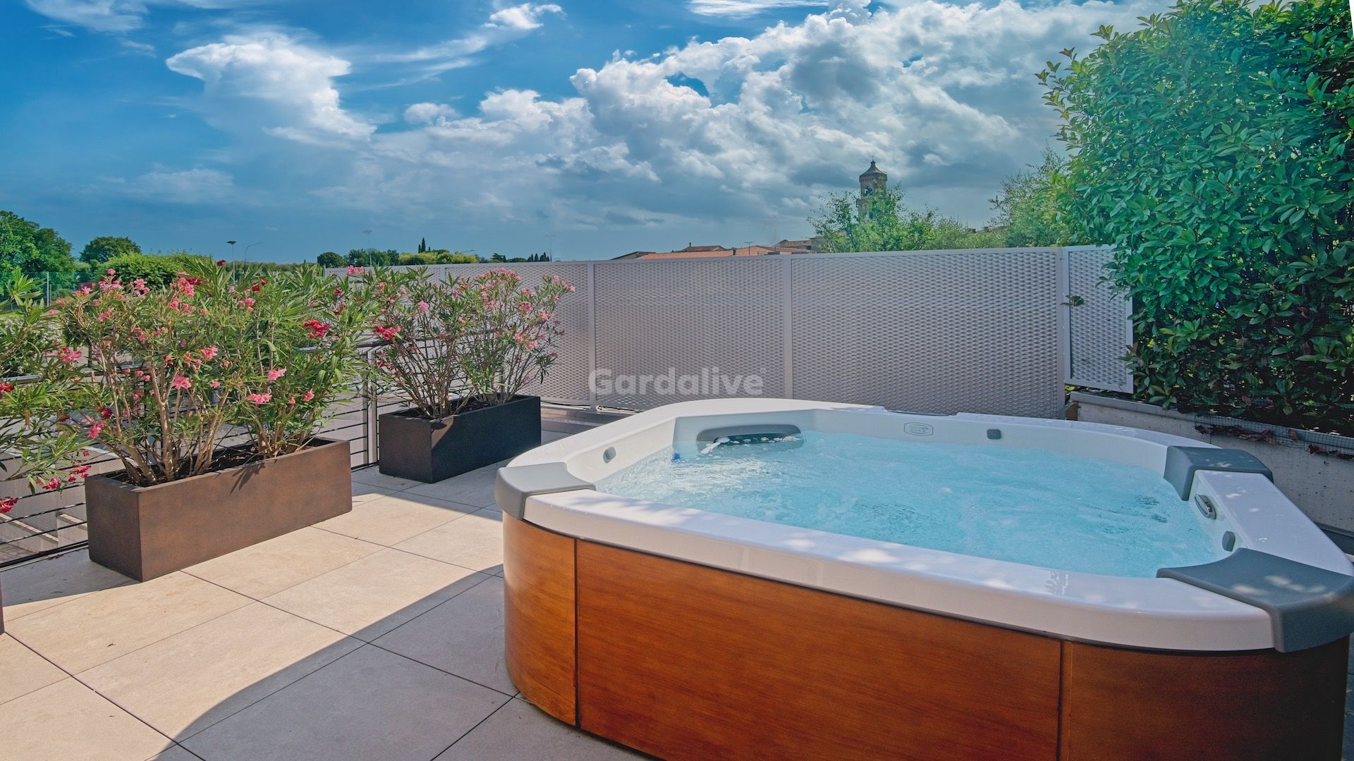 Al piano superiore si trovano una camera da letto separata, un bagno e un'area fitness (che può essere trasformata in una stanza aggiuntiva). Un'ampia terrazza esterna con piante ornamentali ospita una Jacuzzi™ per 4 persone con impianto audio integrato.