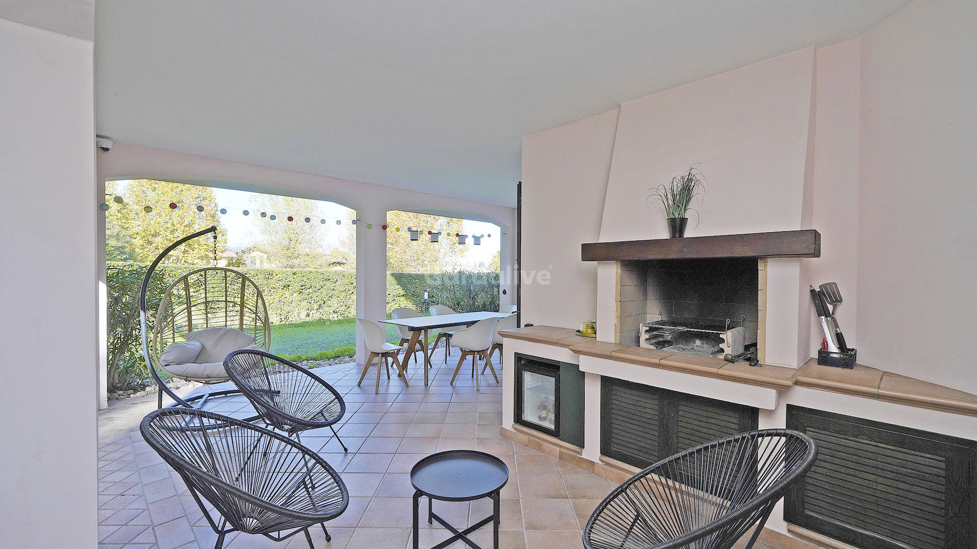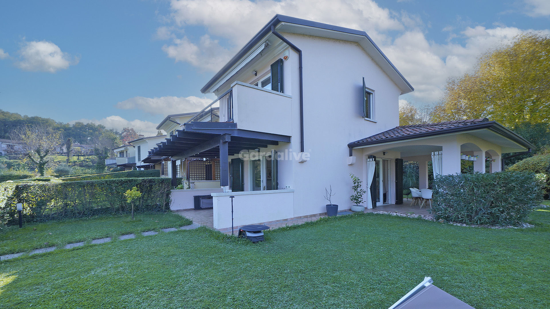 Al piano terra si sviluppa la zona giorno con un ampio soggiorno affacciato sul portico vista piscina, cucina separata e bagno di servizio. Al piano superiore si trovano una camera doppia, un bagno finestrato con doccia e una camera matrimoniale con accesso diretto al balcone, da cui si gode uno scorcio di vista lago e della piscina. L’abitazione è circondata su tre lati da un grande giardino privato, arricchito da due portici coperti e un’area barbecue perfetta per serate estive e grigliate strategiche.