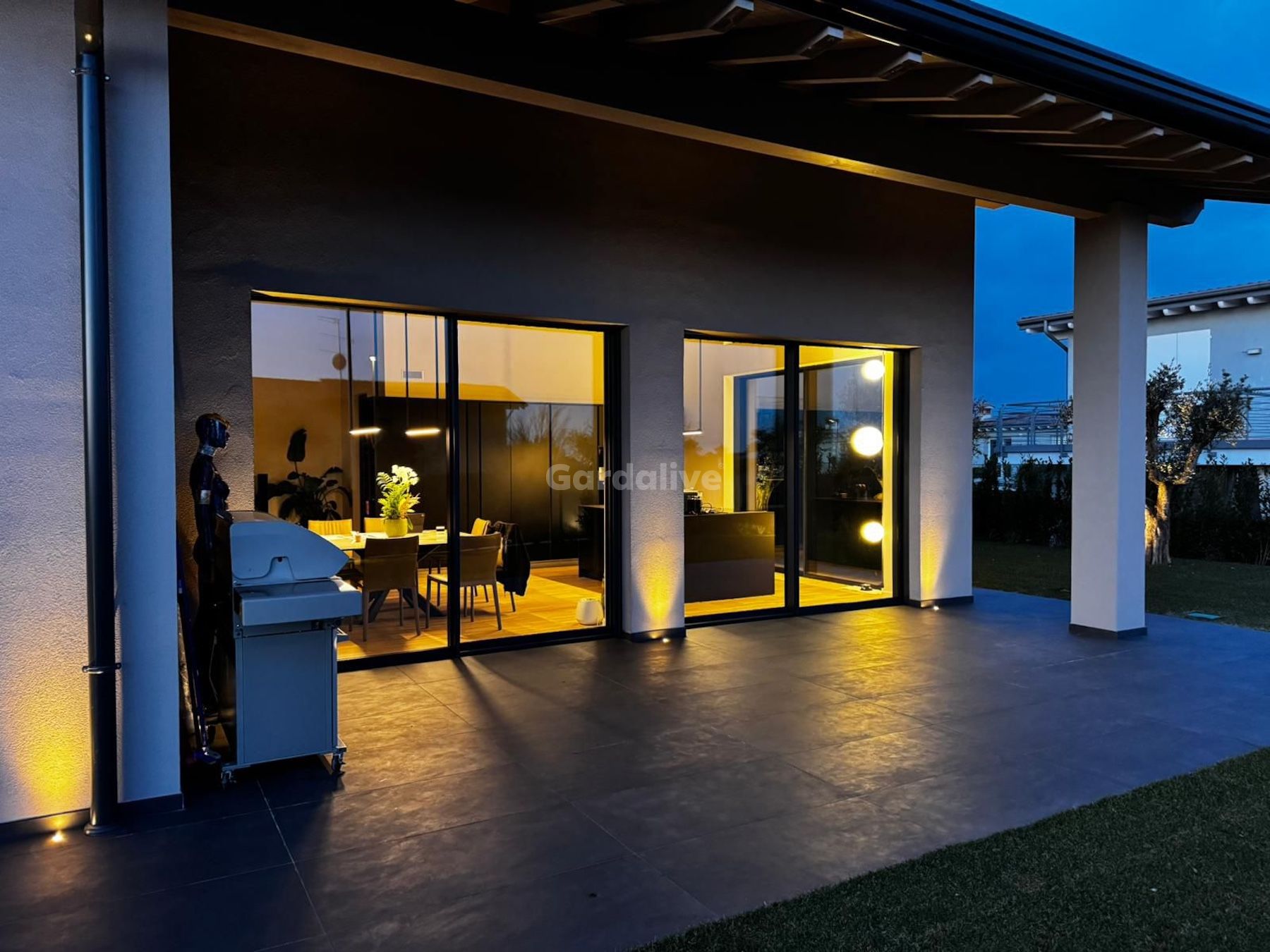Gli ambienti proseguono verso l'esterno attraverso una loggia coperta; questo spazio dialoga con il rigoglioso giardino circostante, piantumato ed impreziosito da un sistema di luci d’atmosfera che ne esalta i volumi nelle ore serali. Per gli amanti del benessere, è già presente l’attacco tecnico per l’installazione di una jacuzzi, trasformando il giardino in un’area wellness privata.