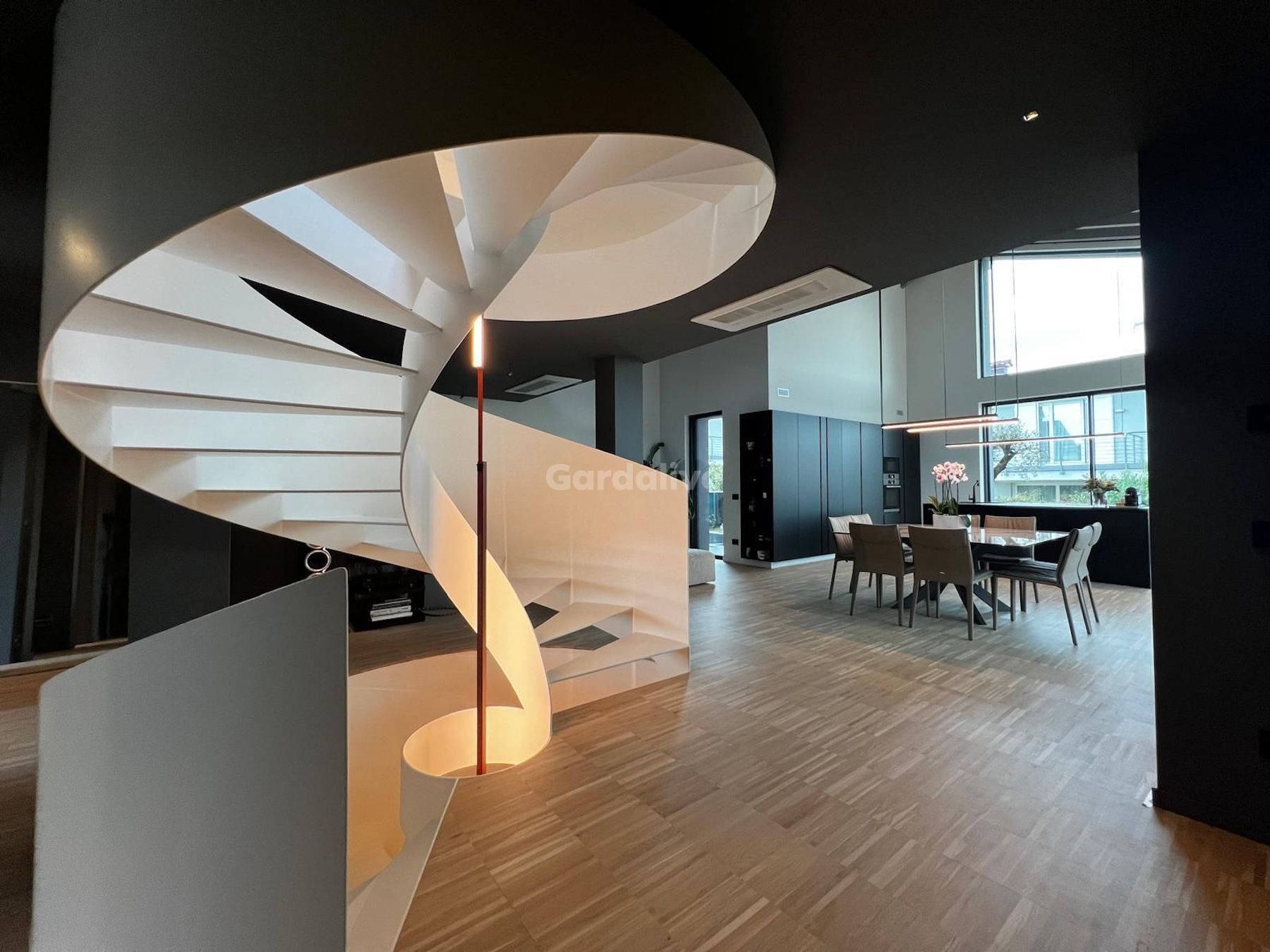 Il collegamento tra i vari livelli è condotto da una scala elicoidale, elemento scultoreo di grande forza visiva, che conduce al piano inferiore. Qui si apre un generoso open space polifunzionale, ideale per essere personalizzato come area fitness, home theatre o sala svago, arricchito da una zona degustazione vini con vetrina a vista, una camera per gli ospiti e un ulteriore servizio.