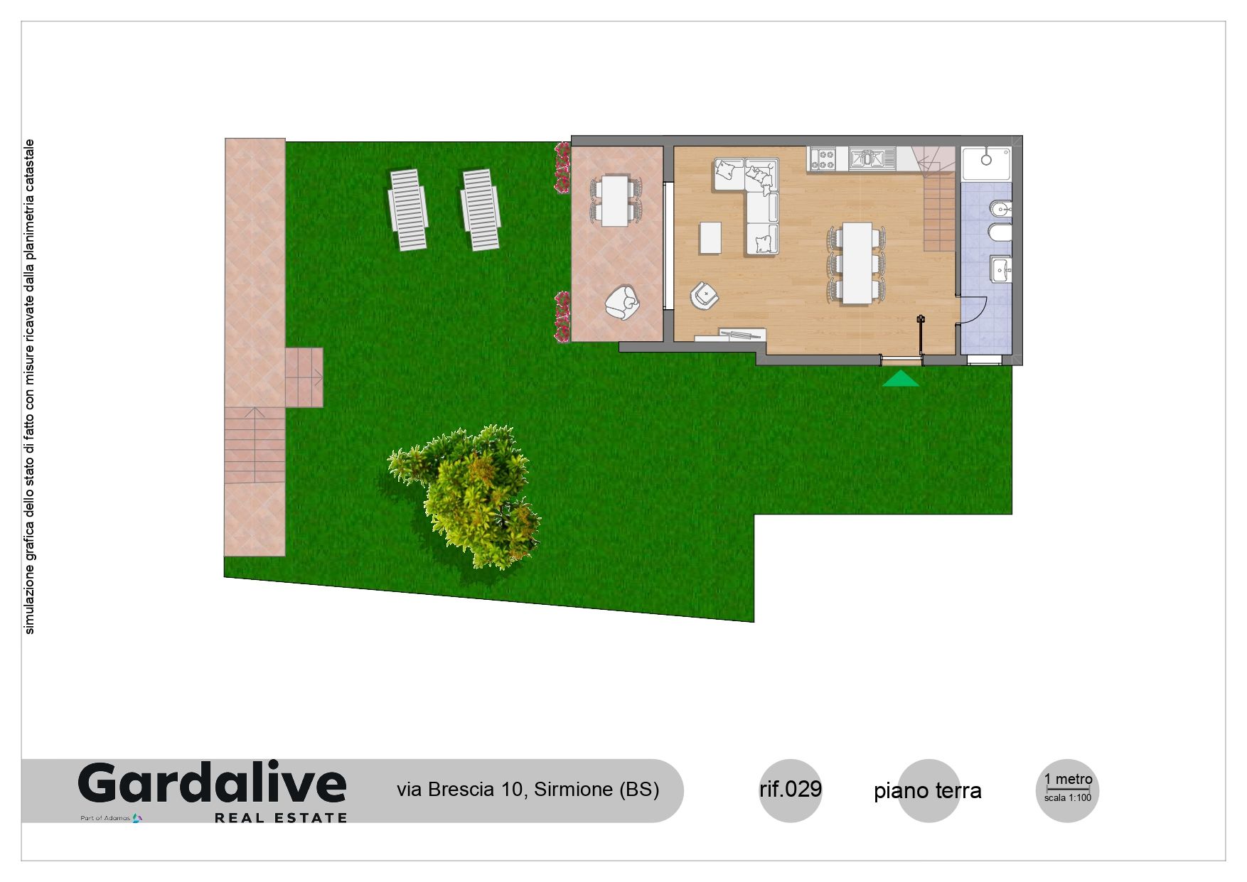 Al piano terra troviamo un luminoso soggiorno con zona cucina, valorizzato da un’ampia porta finestra che conduce al giardino privato, perfetto per pranzi e cene all’aperto e per godere del piacevole clima del Lago di Garda. Sullo stesso piano è presente un comodo bagno.