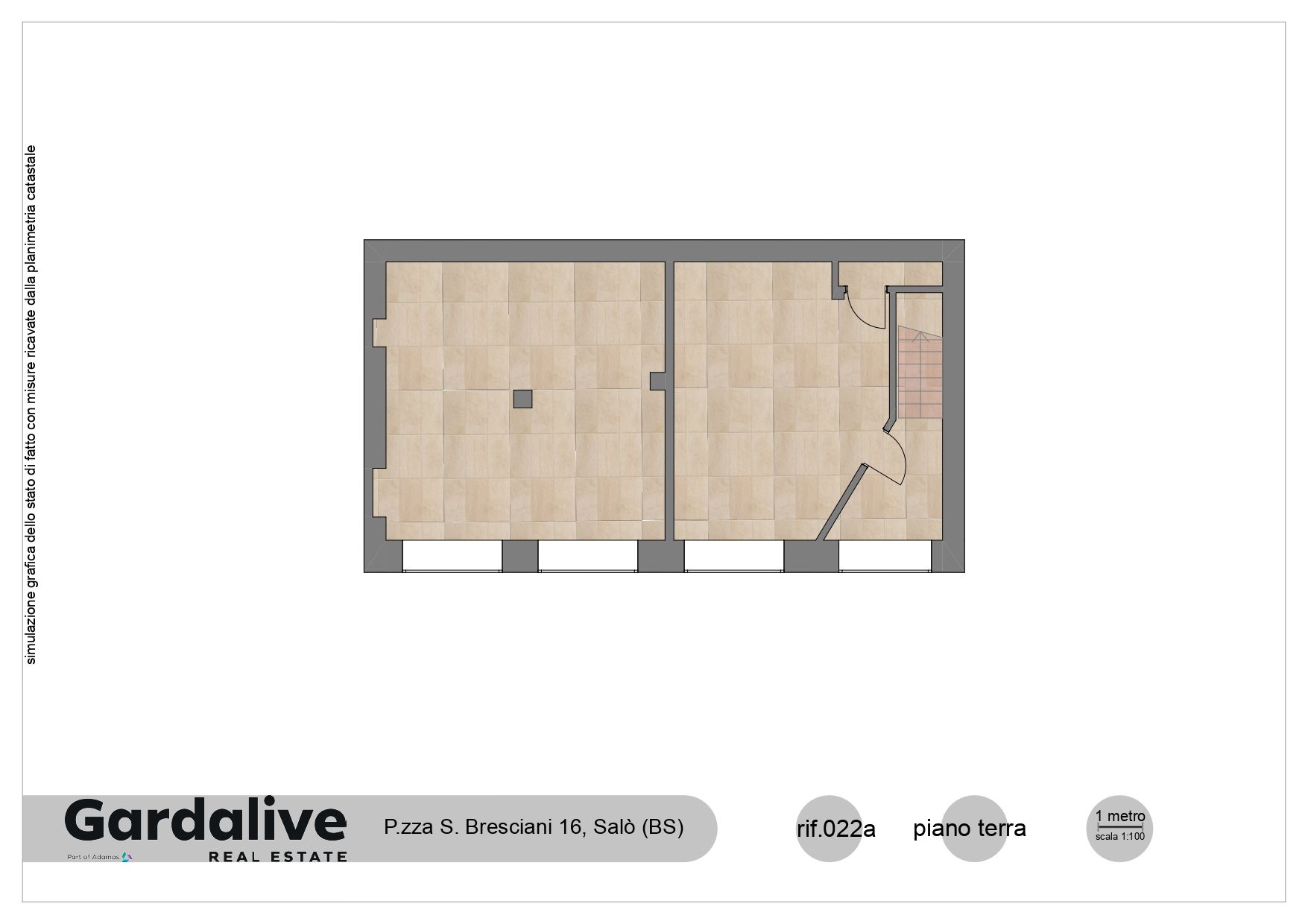 On the ground floor there is the main entrance leading to the upper floors. The remaining part consists of two large rooms with glass windows and direct access to the Piazza, now used for commercial activities.
