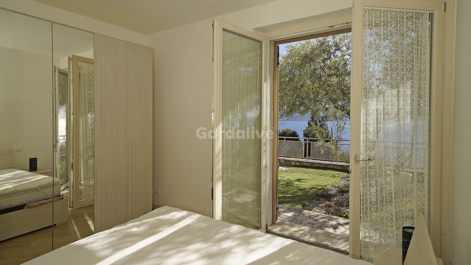 The first floor, with its own entrance, offers an elegant apartment comprising a living room and open-space kitchen, a panoramic terrace, a double bedroom overlooking the lake, a single bedroom, and a windowed bathroom.